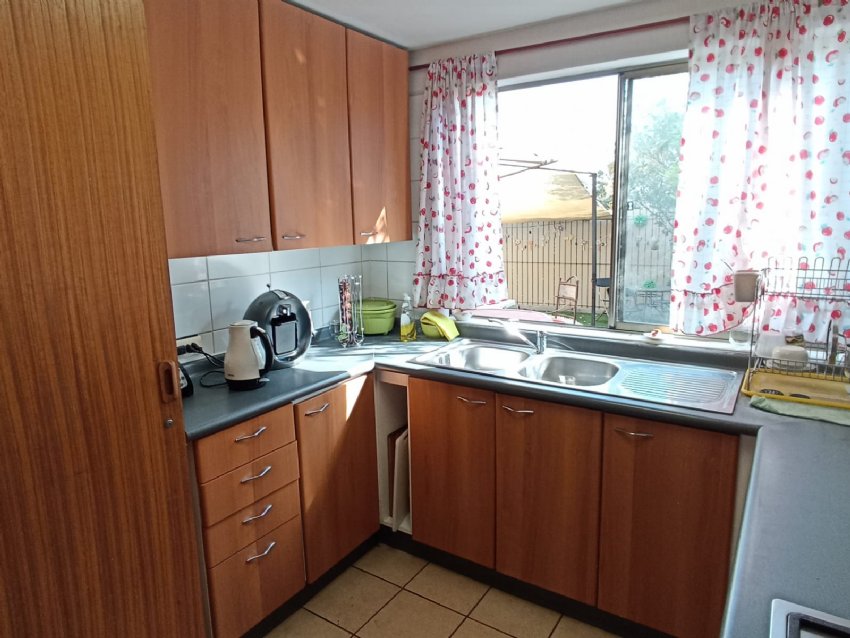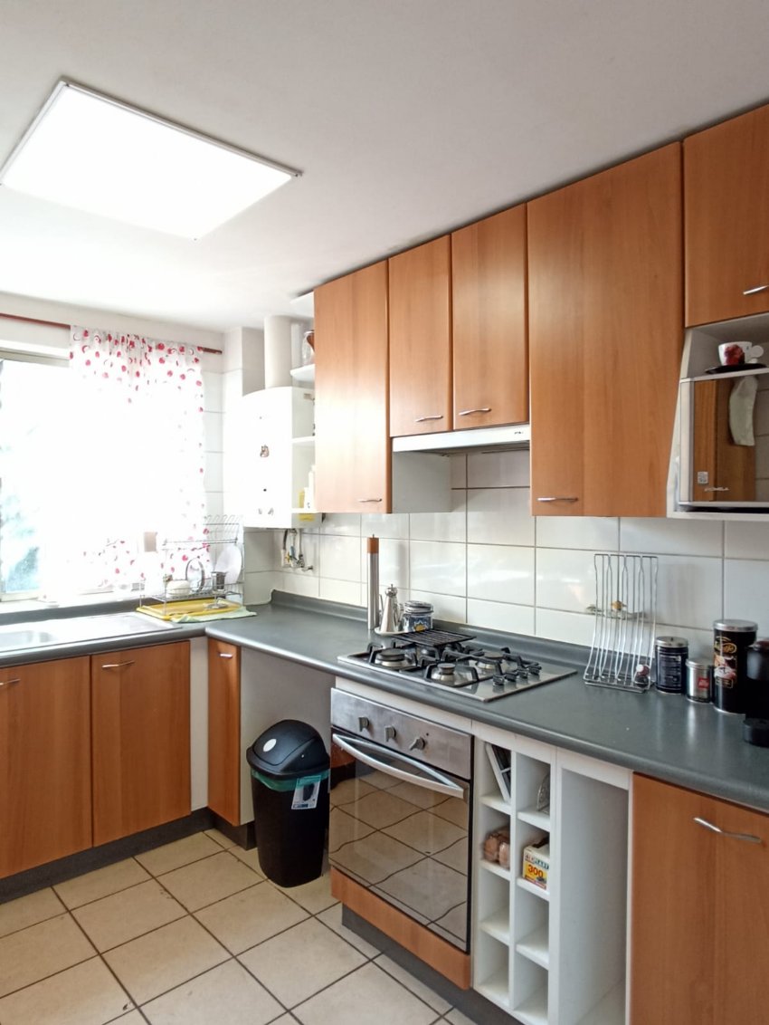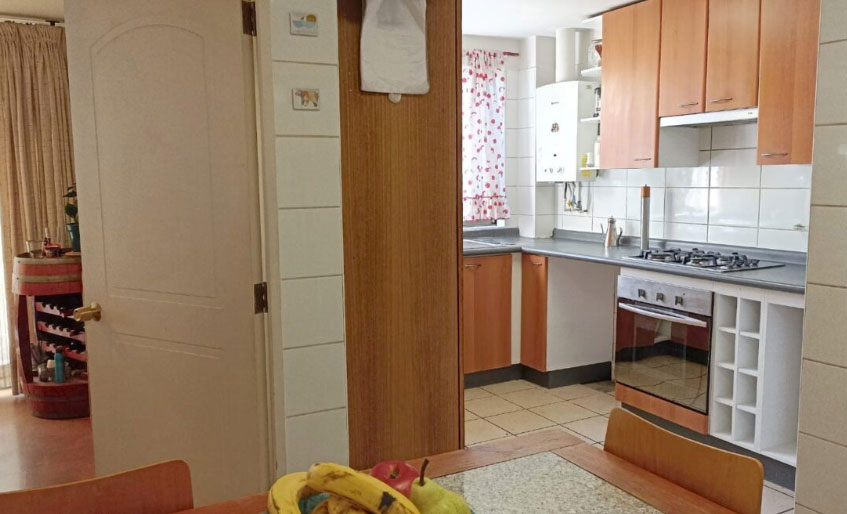 Cocina amoblada y equipada (horno empotrado, cocina encimera y campana), con comedor de diario.