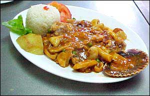 Filete de corvina a la plancha, baada en fina salsa de mariscos, especias peruanas y aj.