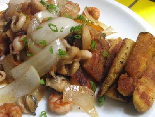 Variedad de mariscos, papas fritas, cebolla morada, tomate, cilantro, saltado en salsa de soya.