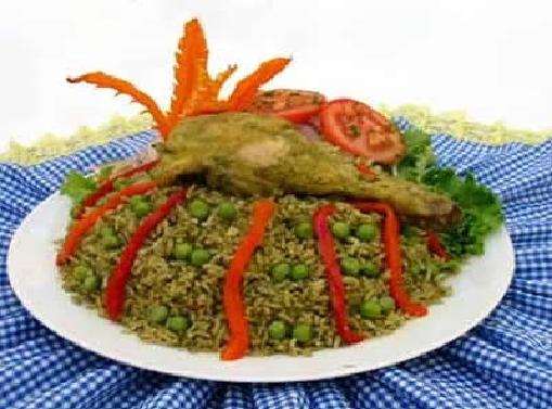 Delicioso arroz cocido en fume con especias peruanas acompaado de pollo en una combinacion de cilantro, zanahoria, pimiento y choclo peruano.