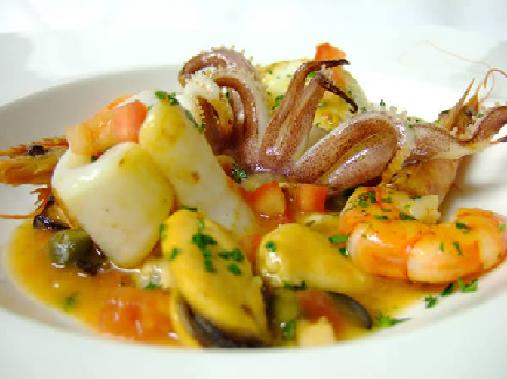 con deliciosos mariscos (pulpo, calamar, camarn, machas).