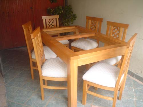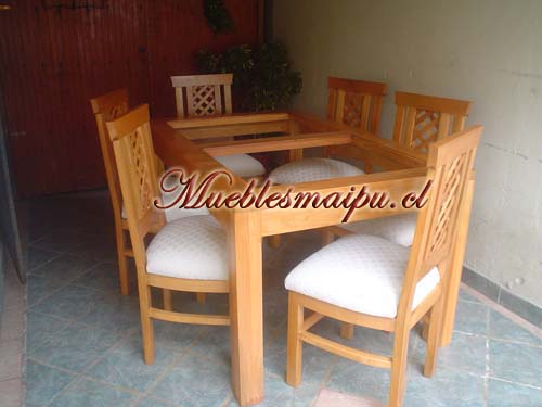 Comedor madera rauli con vidrio 1.60 x 90 cms. + 6 sillas con bastidores |