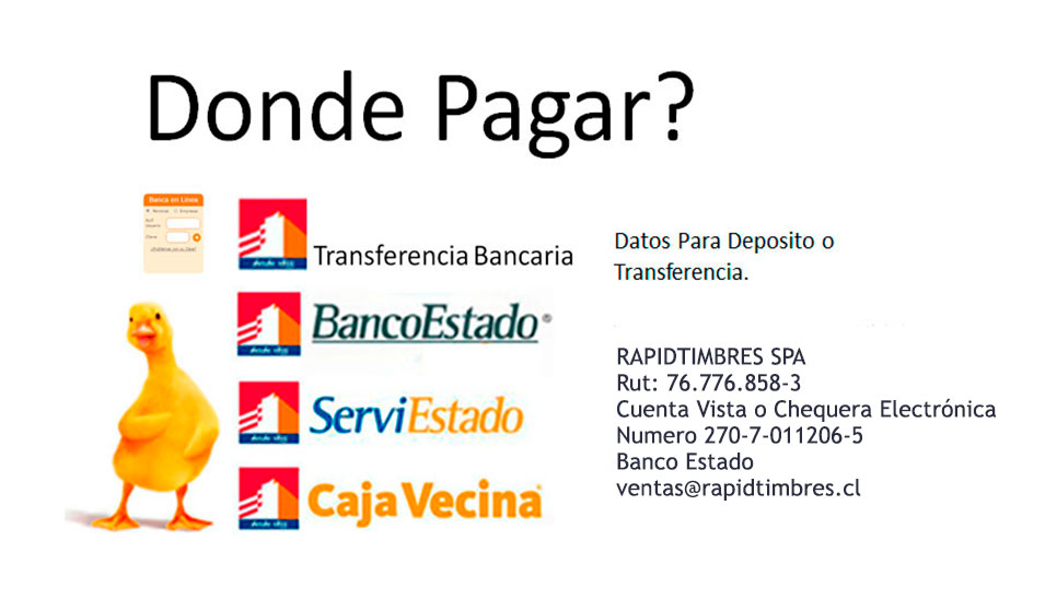 Para regiones o por envió por chile chilexpress u otro turbus, usted cancela 50% por anticipado una vez revisada la propuesta. una vez terminados los timbres, enviamos fotos del producto terminado luego cliente deposita, enviamos sus timbres y hacemos llegar por correo numero de orden de transporte para su seguimiento.